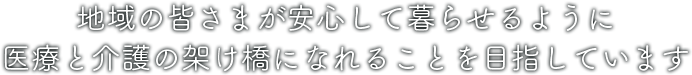 住み慣れた宇佐市で、自分らしく暮らし続けることができるよう、在宅での療養支援や入・退院時の支援など、高齢者に医療と介護を包括的に提供できるための架け橋となることを目指してまいります。