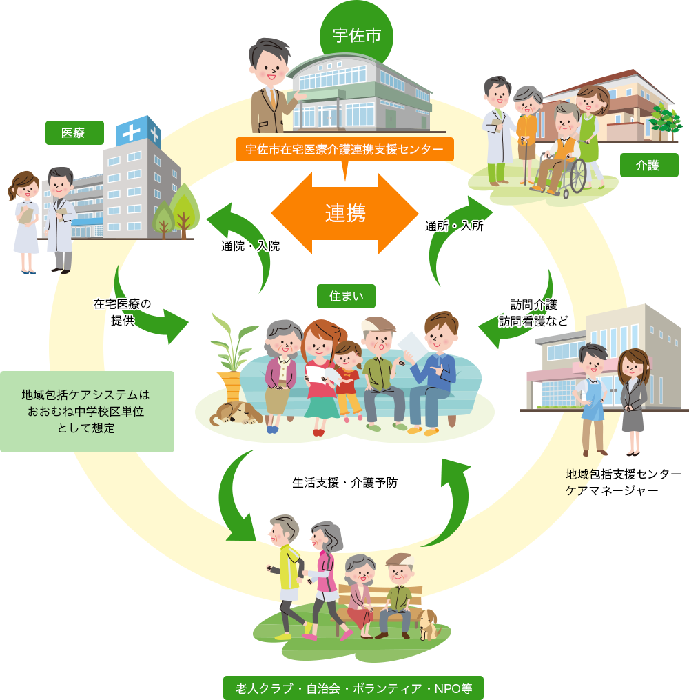 住み慣れた宇佐市で、自分らしく暮らし続けることができるよう、在宅での療養支援や入・退院時の支援など、高齢者に医療と介護を包括的に提供できるための架け橋となることを目指してまいります。