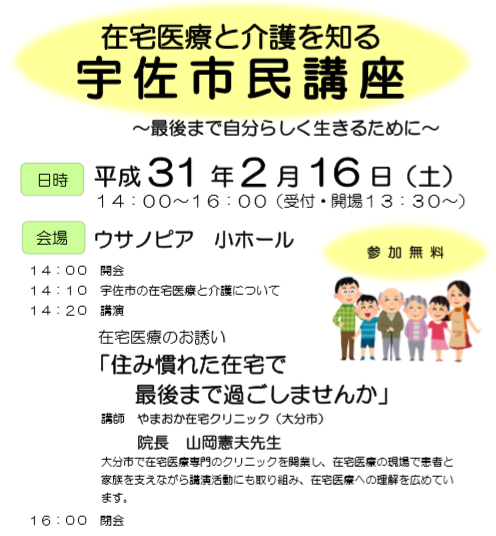 平成31年2月16日(土) 14:00~16:00 在宅医療と介護を知る 宇佐市民講座を宇佐市医師会主催、宇佐市役所共催にて開催します。講師には、大分市で在宅医療専門のクリニックを開業されている山岡憲夫先生をお招きしています。市民の方はもちろん、専門職の方も貴重なお話が聞ける機会ですので、ご参加お待ちしています。