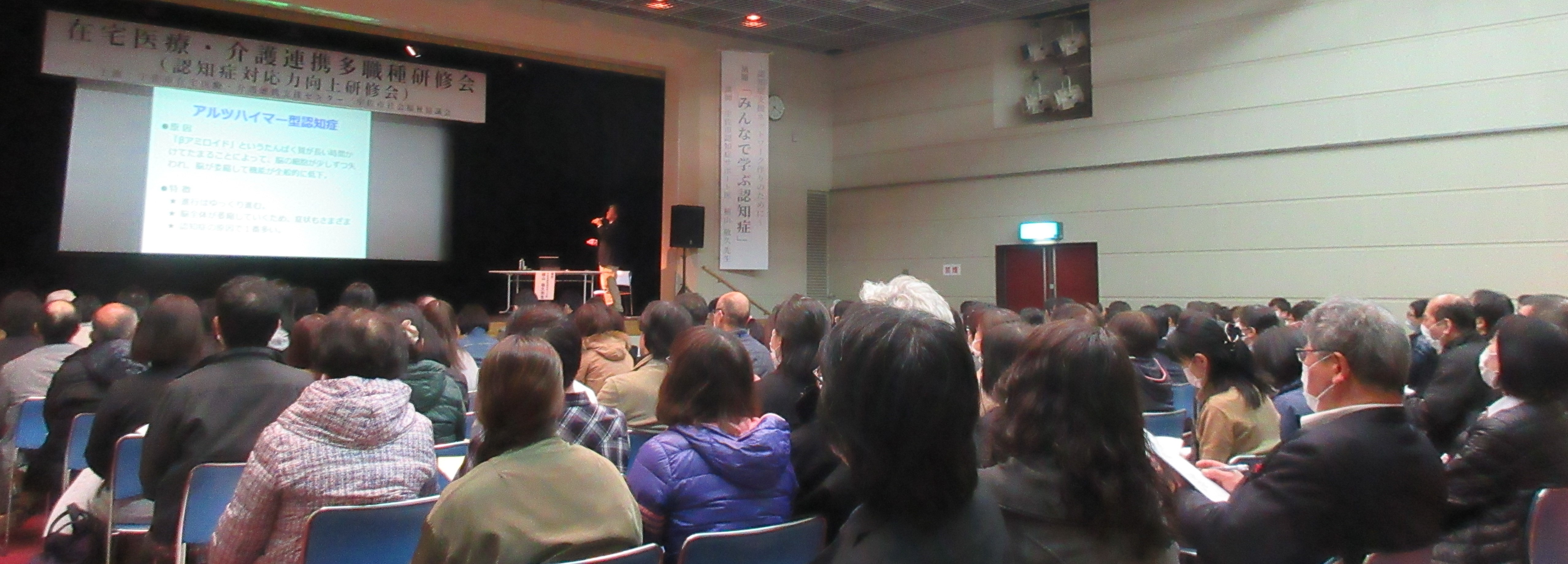 講演では、植山先生から認知症の症状と治療の現状など説明があり、医師や医療・介護専門職間の縦割り目線ではなく、本人の意思が尊重される医療や介護を行うために患者の症状や日常生活などの情報を医療・介護従事者が連携・共有することの重要性について話されました。